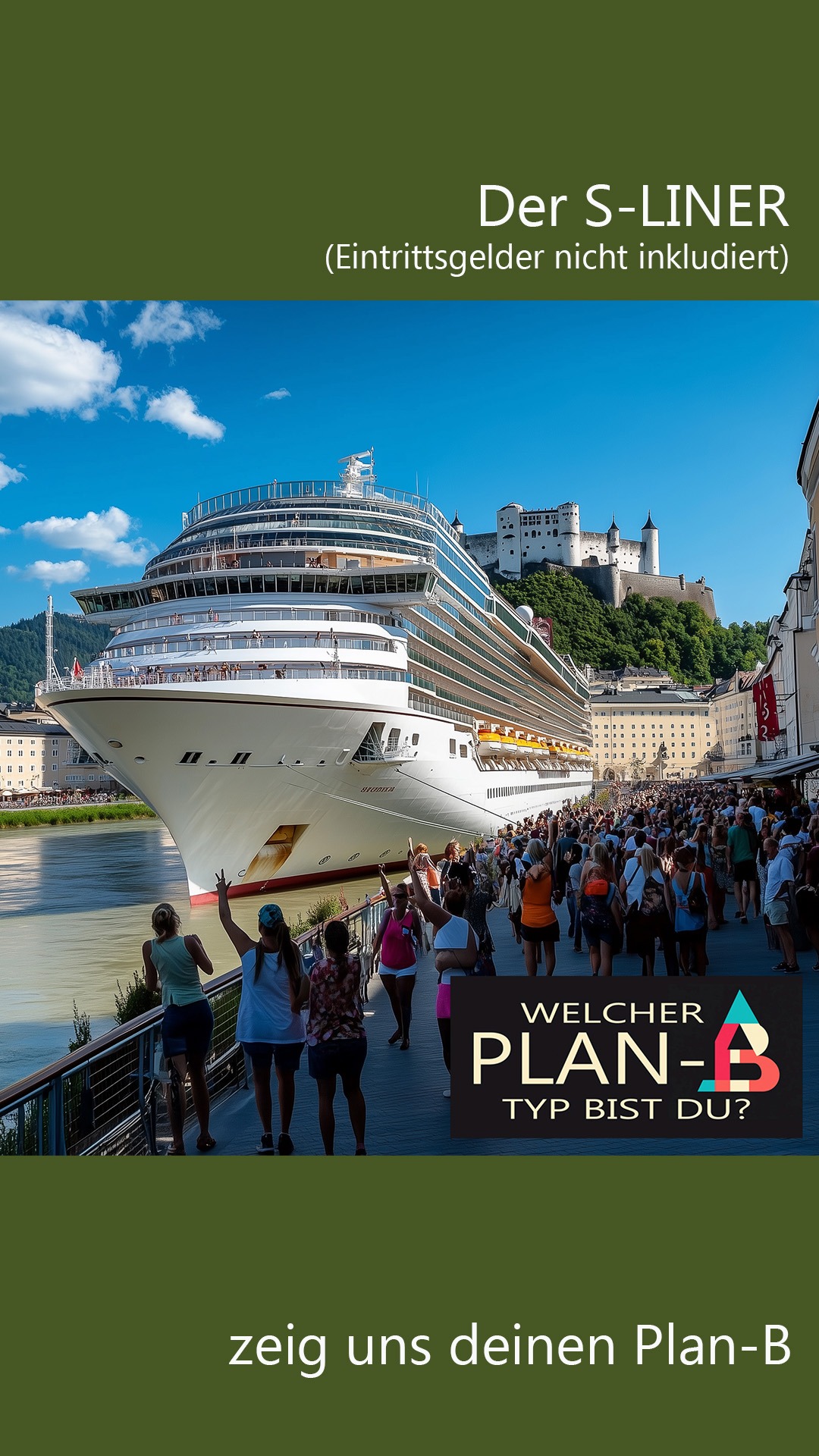 Der S-LINER der S-LINIE, mit dem Mutterschiff NANNERL ... damit sind die Eintrittspreise für die Altstadt fixiert und die Tourismuswelle hat Anschluss an alle anderen PLAN-B's* ... und jetzt die Frage; Welcher Plan-B Typ bist du? *wir wissen, dass das falsch geschrieben ist, aber uns gefällt das besser ;-))