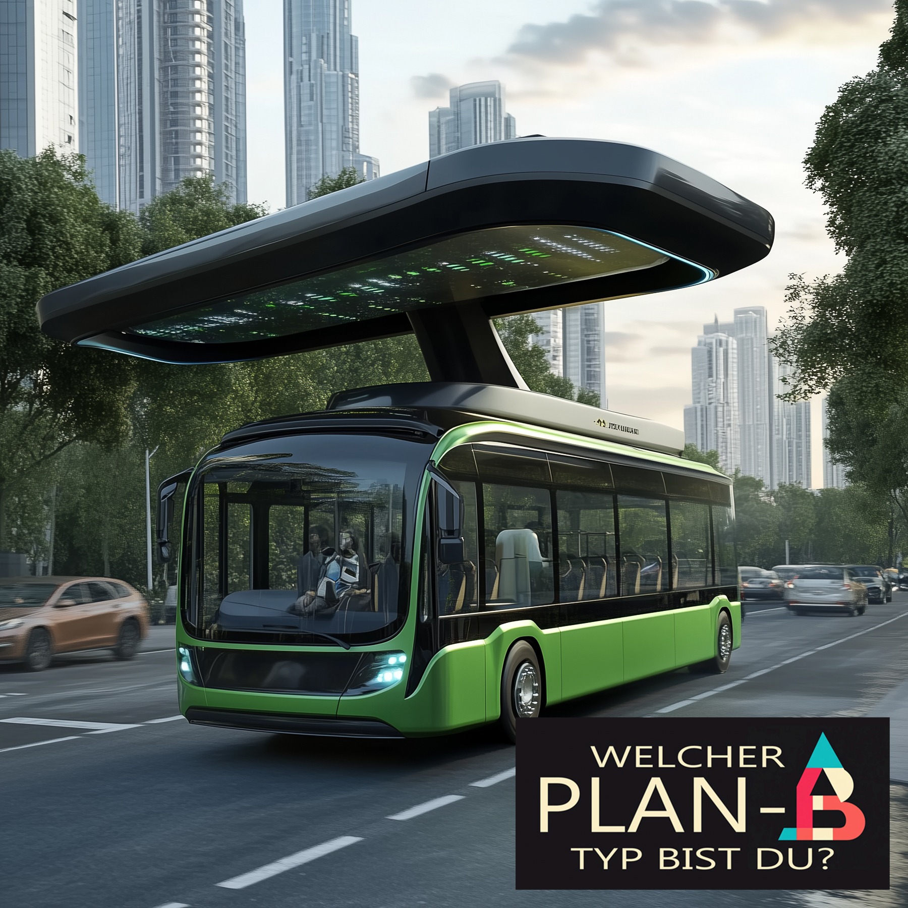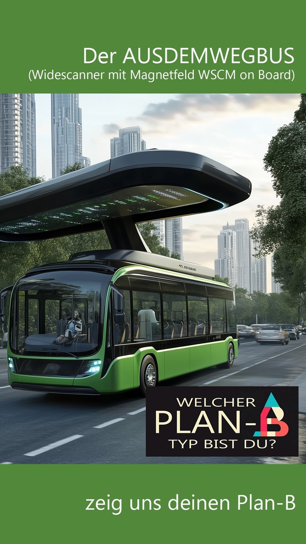 Achtung hier kommt der Über-PLAN-B, hier kommt der AUS-DEM-WEG-BUS. Das ist kein O-BUS und auch keine fahrende Fliegenklatsche, das ist die infrarot gesteuerte Laser-Magnet-Abwehranlage in fahrender Form. Das steht garantiert nichts mehr im Weg. Und wenn doch ... in sekundenbruchteilen gibt es frei Bahn. Die grüne Farbe täuscht etwas, Umweltverträglich ist dieses Ungetüm nur bedingt, fährt mit Atomstrom ... ein etwas unschöner PLAN-B ... und jetzt die Frage; Welcher Plan-B Typ bist du?