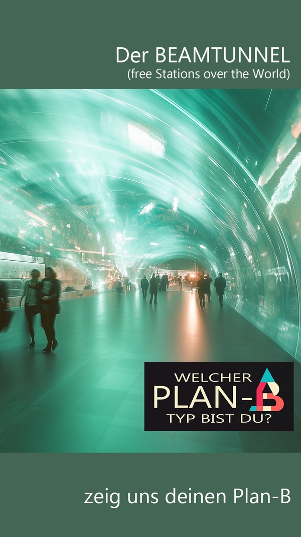 und weil es so schön ist hier noch einer von vielen BEAM-TUNNEL ... beamen in der gruppenstärksten Form, bis zu 400 Personen gleichzeitig und dennoch an verschiedene, individuelle Orte ... ein ausgereifter Multibeamer welcher an jeder zentralen Stelle aufgebaut werden kann ... ACHTUNG! WICHTIG! Nur zu betreten mit gültigem Beamzeugnis! ... jedenfalls ein strahlender PLAN-B ... und jetzt die Frage; Welcher Plan-B Typ bist du?