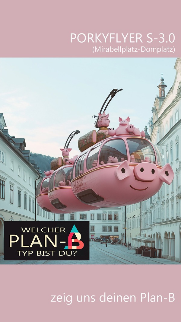 Der PORKY FLYER S-3 ein sog. SUPRA-FLYER (das Modell wurde designed on der K&KHofzuckerbäckerei Mirabell in Zusammenarbeit mit GASTKOM) hier in der Verlängerung vom Mirabellplatz zum Domplatz ... der rosaroteste alles PLAN-B's* ... und jetzt die Frage; Welcher Plan-B Typ bist du? *wir wissen, dass es die B-Pläne wären, gefällt uns aber so nicht ;-))