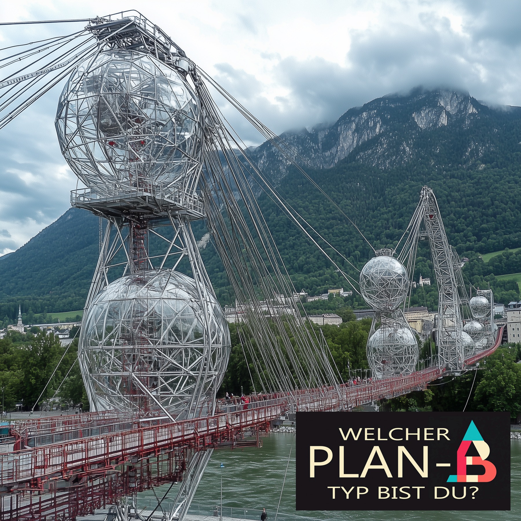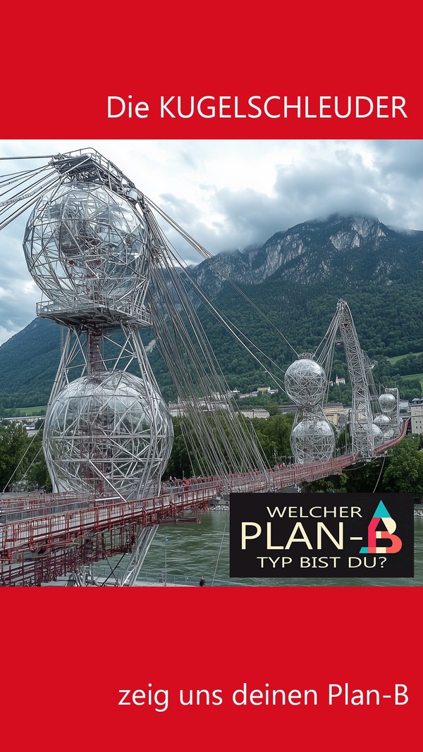 die KUGELSCHLEUDER Vers.2.0, in jeden Brückenbau integrierbar ... geschleudert wird von Brücke zu Brücke und am jeweiligen Ziel gehts mit Seilen weiter. Ein Beispiel; Einstieg Ursteinbrücke -- Hellrunner Brücke -- Wilhelm-Kaufmann-Steg -- Überfuhrsteg -- Karolinenbrück (Ziel Unfallkrankenhaus erreicht) ... ein durchaus schwungvoller PLAN-B ... und jetzt die Frage; Welcher Plan-B Typ bist du?